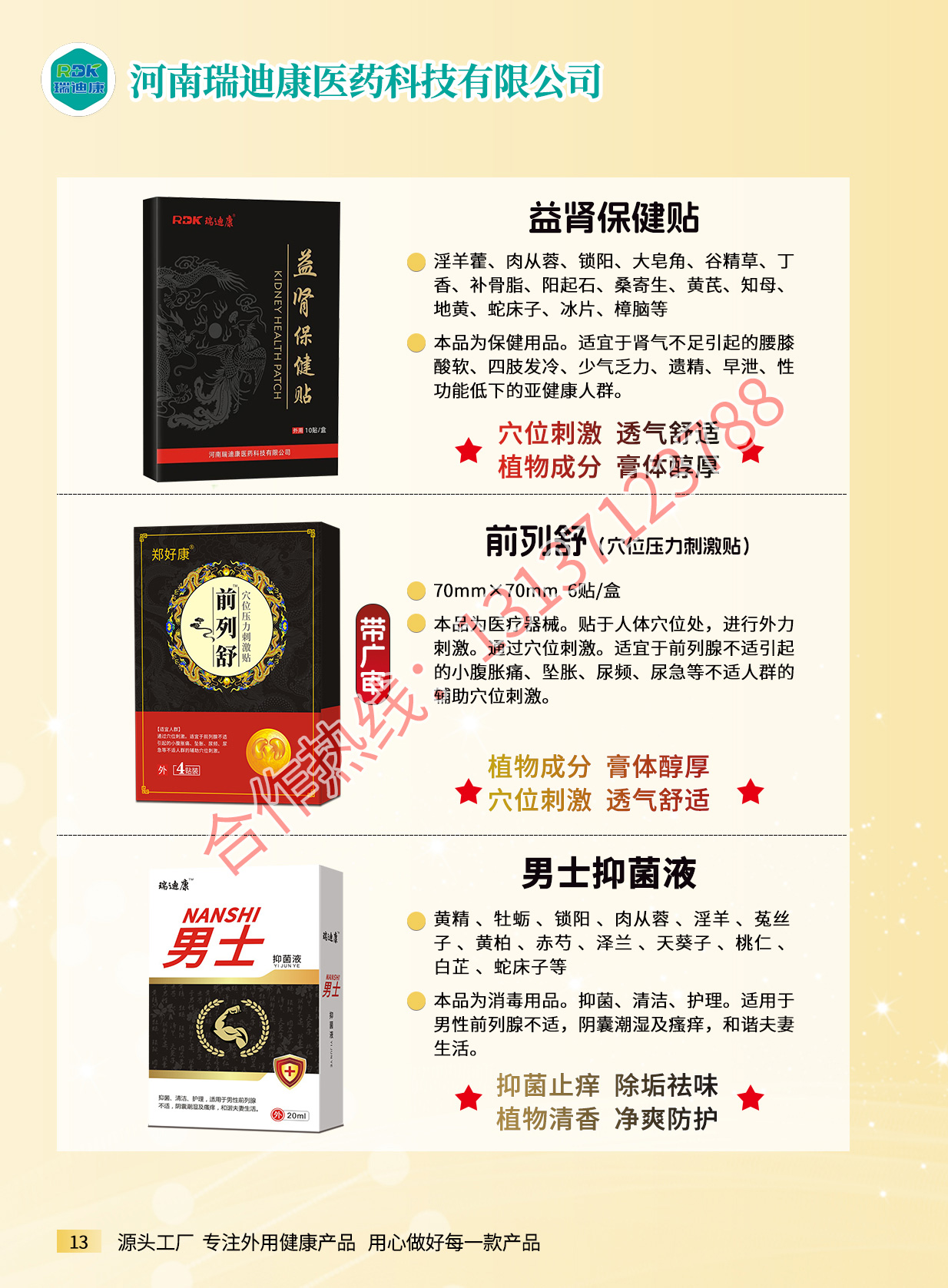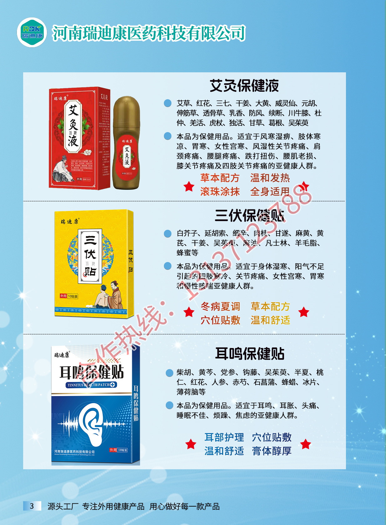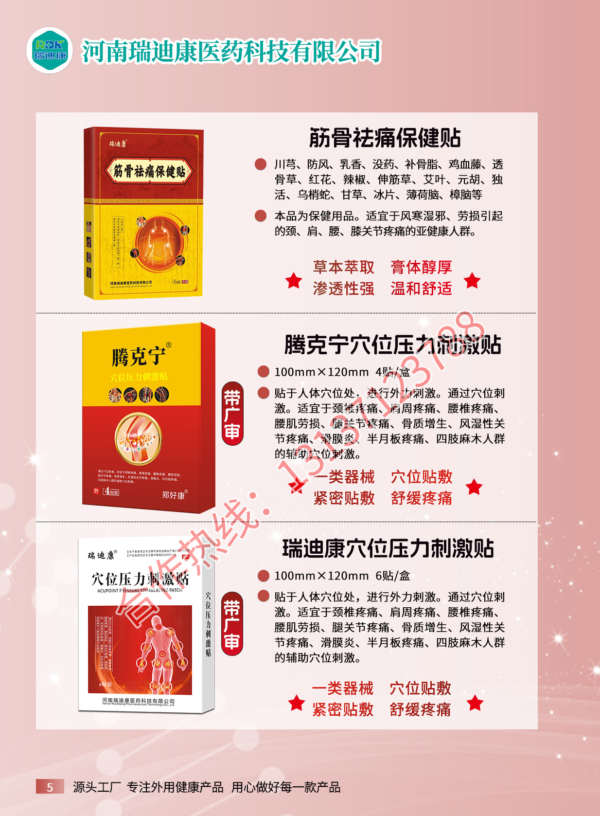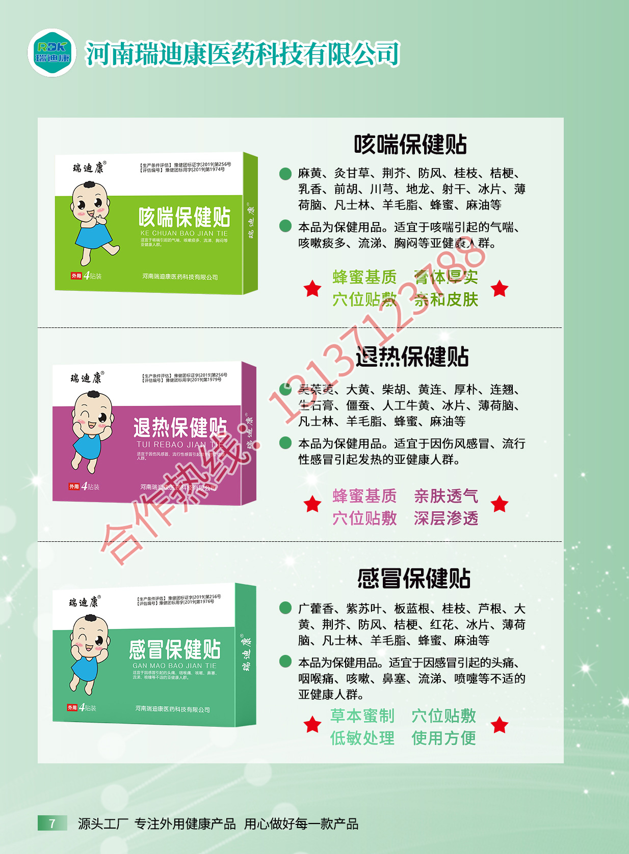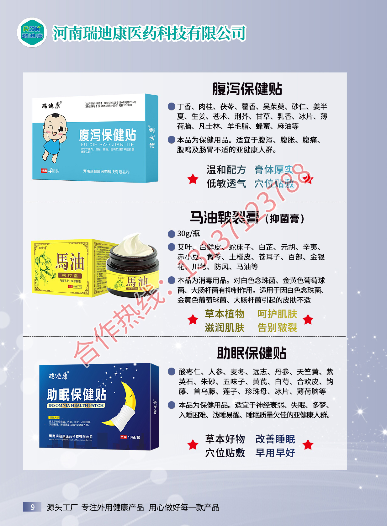 想做自己的膏药品牌,没商标、没资质、没工厂,就找瑞迪康医药科技,专业承接膏药贴牌代加工业务,专业生产蜂蜜贴、穴位贴、乳膏、喷剂、冷敷凝胶、膏药、粉剂等,产品大类包括保健用品、一类器械、消毒用品、日用品,产品类别包括疼痛外用产品,如艾灸保健液,筋骨祛痛保健贴等,护眼产品包括眼保健贴,明目保健膏(滚珠眼...