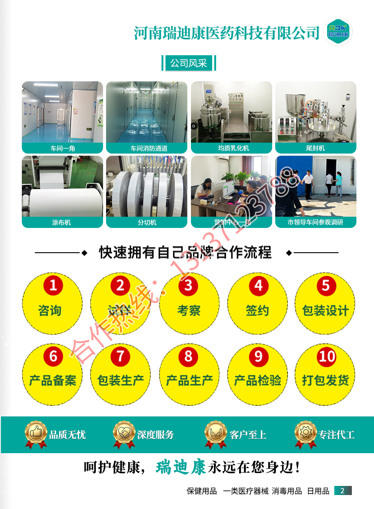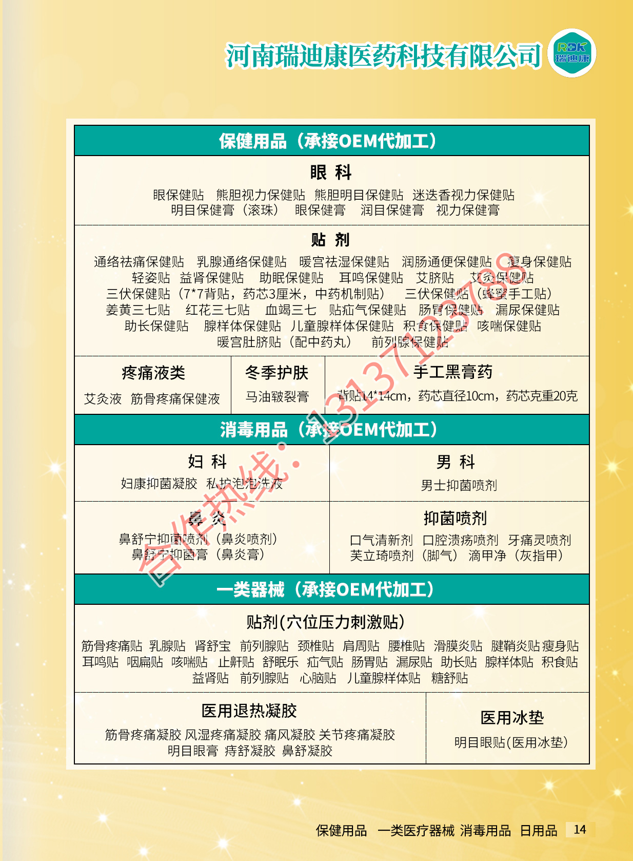 河南瑞迪康医药科技有限公司主要经营一类器械、卫消证字号产品OEM、抑菌制剂OEM(液体、膏体、黑膏贴剂、凝胶)、健证字号产品OEM、保健用品OEM(粉剂、黑膏贴剂、膏剂、片剂、凝胶)。主要加工模式:OEM贴牌加工、ODM加工、委托加工、贴牌加工。咨询电话:13137123788