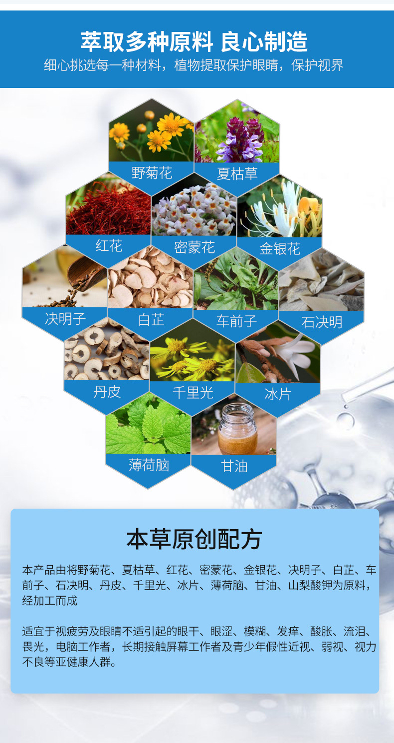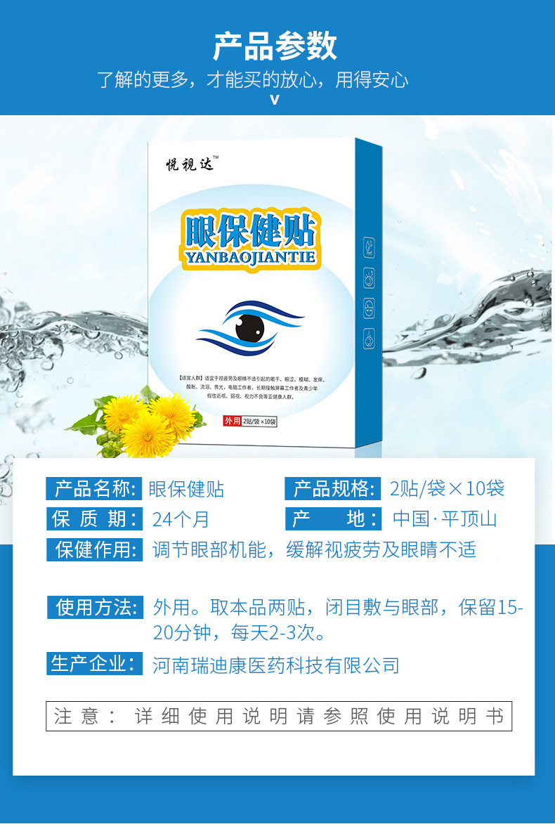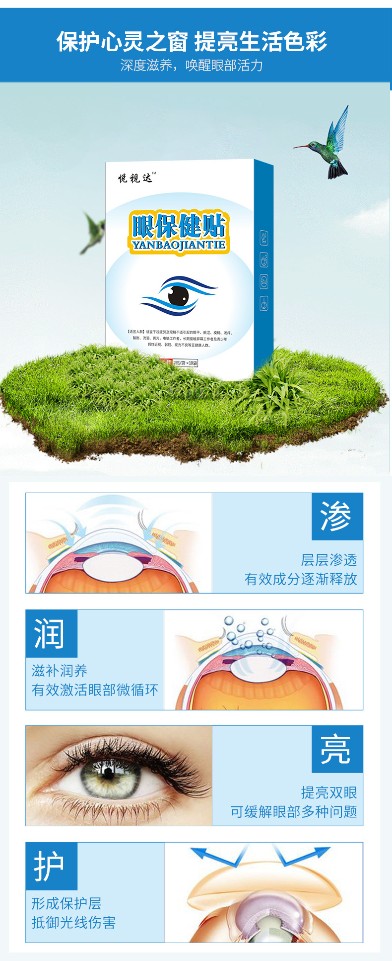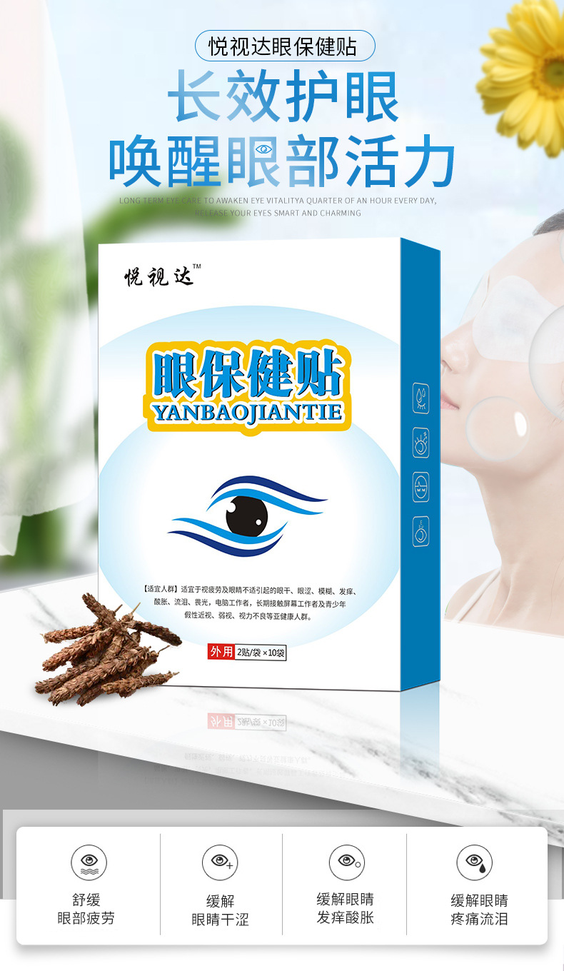 悦视达眼贴是以野菊花、夏枯草、红花、密蒙花、金银花、决明子、白芷、车前子、石决明、丹皮、千里光、冰片、薄荷脑、甘油、山梨酸钾为原料,经加工而成。【保健作用】调节眼部机能,缓解视疲劳及眼睛不适,促进眼睛健康。
